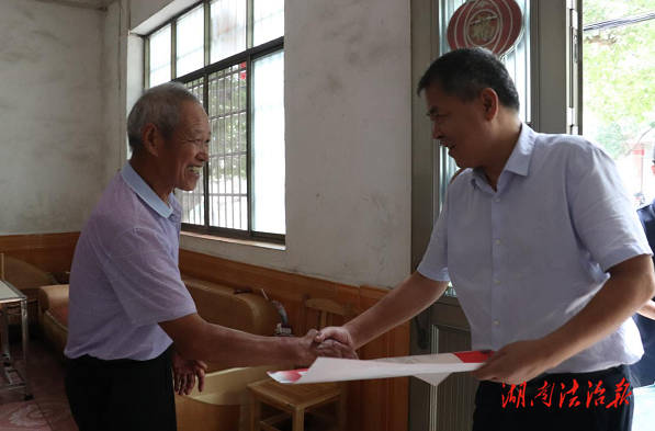 湖南法治報訊(通訊員 王玉萍)在“八一”建軍節(jié)即將來臨之際,7月31日上午,區(qū)黨委書記易恢節(jié)開展“八一”走訪慰問活動,為退役軍人送去黨委、管委的關(guān)懷與溫暖,并致以節(jié)日問候、崇高敬意和美好祝福。區(qū)民政和退役軍人事務(wù)局主要負責人陪同慰問。